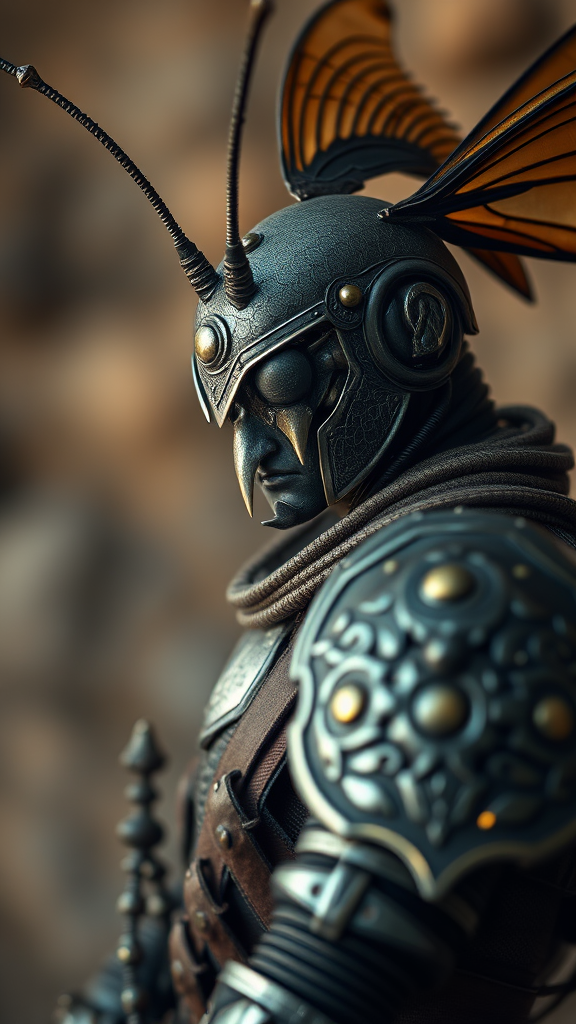 Mosquito warrior, fine art portrait photograph captured with a Hasselblad H3DII, featuring an intricately detailed figure adorned in armor inspired by nature and insects, set against a soft-focused background that enhances depth of field, embodying a harmonious blend of warrior strength and the delicate intricacies of a mosquito's form, showcasing the textures and colors of the natural world with artistic flair.