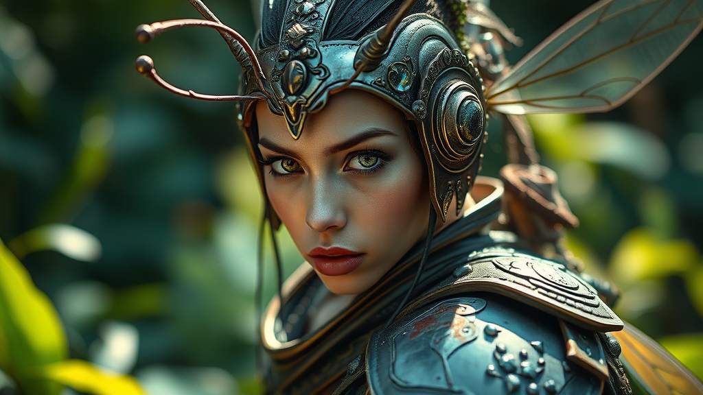 Mosquito warrior, fine art portrait photograph captured with a Hasselblad H3DII, showcasing intricate details and depth of field, ethereal atmosphere with dynamic lighting highlighting the subject's features, dressed in a blend of nature-inspired armor with subtle metallic hues, blending seamlessly into a lush, verdant background, sharp focus on the character's determined expression, artistic composition that evokes a sense of mythical elegance and strength.