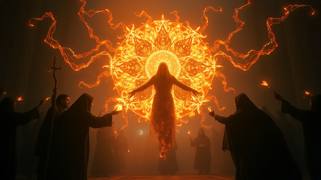 Motion-Capture Coven Casting Enormous Spell Magic Witchcraft Ember Glow Lightcore Intricate Illumination Epic Light Nightscape Supernatural Background Dramatic Lighting Hyperrealistic Highly Detailed Hyperdetailed 8k Cinematic UHD HD HQ CGSociety Dark Aura Ethereal Scene Mystical Atmosphere 13:7 Ratio Striking Visuals Dazzling Complexity