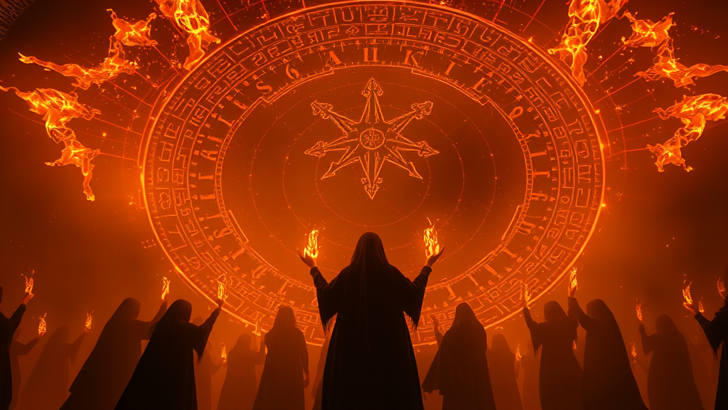Motion-Capture CovenCasting Massive Spell Magic Witchcraft Ember Glow Lightcore Intricate Light Pollution Epic Light Under-Illumination Blocksberg Backdrop Dramatic Lighting Hyperrealistic Detailed Hyperdetailed 8k Cinematic UHD 1080p High Quality CGSociety Dark Aesthetic Enhanced Shadows Witches' Circle Enchantment Ritual Ethereal Atmosphere Mystical Aura Celestial Alignment Spectral Glow Ancient Runes Enigmatic Symbols Whispering Winds Twilight Hour Occult Energy Charged Air.