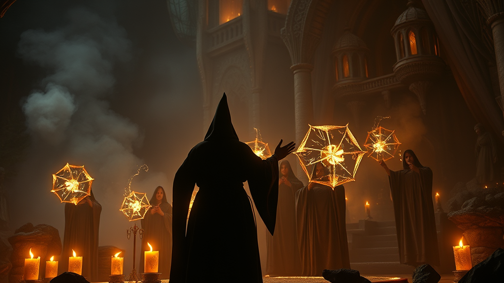 Motion-Capture Enchantment Ritual - Coven Casting a Super Massive Spell - Magic and Witchcraft in Ember Glow - Intricate Light Effects with Epic Under-Illumination - Blocksberg Background - Dramatic Cinematic Lighting - Hyperrealistic and Detailed - Hyperdetailed 8k Resolution - UHD and 1080p Quality - CGSociety Style - Dark Mystical Aesthetic.