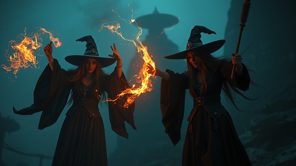 Motion-Capture Enchantment: Witches Casting a Supermassive Spell - Magic and Witchcraft with Ember Light - Intricate Lightcore and Epic Light Pollution - Under-Illumination at Blocksberg Background. Dramatic Lighting with Hyperrealistic, Realistic Detailed, and Hyperdetailed visuals. 8k Cinematic UHD with 1080p HQ quality, inspired by CGSociety. Featuring a Dark Aesthetic, maintaining a surreal yet compelling atmosphere at a creative level of intensity.