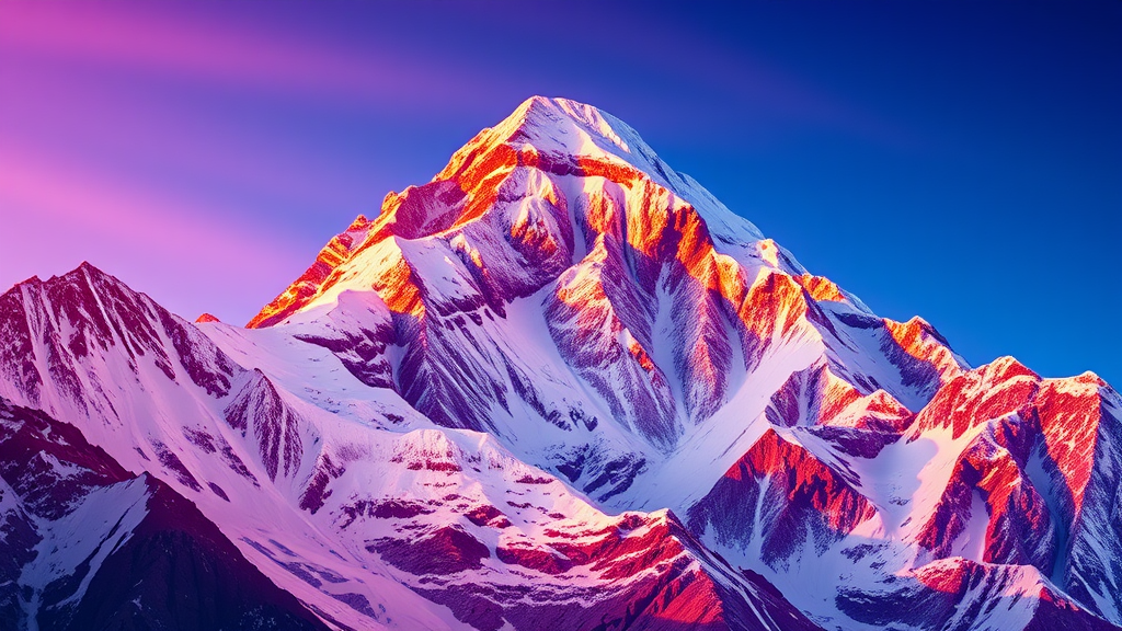 Mount Everest depicted as a vibrant illusory wallpaper, featuring colorful realism with modular design elements, capturing intense close-ups. The image is ultra-high-definition, showcasing a blend of realism and artistic abstraction. The breathtaking details of the mountain are interwoven with imaginative patterns, enhancing the mystique and grandeur of Everest's landscape.