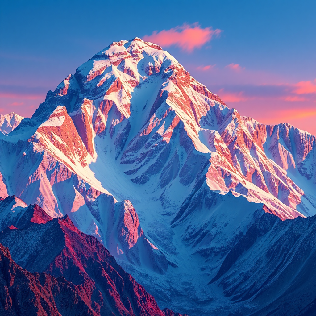 Mount Everest depicted as an illusory and vibrant wallpaper, featuring colorful realism with intricate modular patterns. The image highlights intense close-ups capturing the majestic details of the mountain, presented in ultra-high definition realism. The scene encapsulates the ethereal beauty of Everest with a mix of vivid hues and immersive depth, drawing the viewer into its breathtaking visage.
