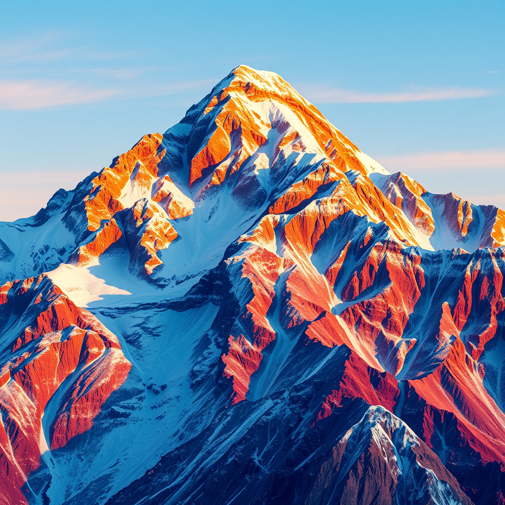 Mount Everest depicted as captivating illusory wallpaper, showcasing vibrant realism through modular designs and intense close-ups, ultra-high-definition imagery, rich with detail and depth, presenting the majestic mountain in a feast of color and form, evoking the grandeur of nature on a massive scale, panoramic view, mesmerizing patterns intertwining throughout.