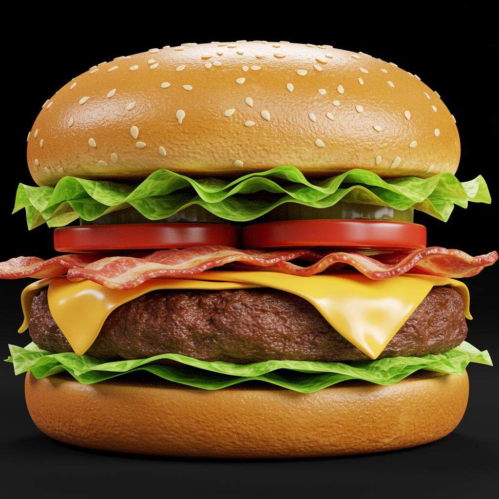 Mouthwatering hamburger loaded with crispy bacon, fresh lettuce, juicy tomato, and melted cheese; promotional image; hyperquality; product shot; vibrant full-color; intense render; irresistible and savory appeal