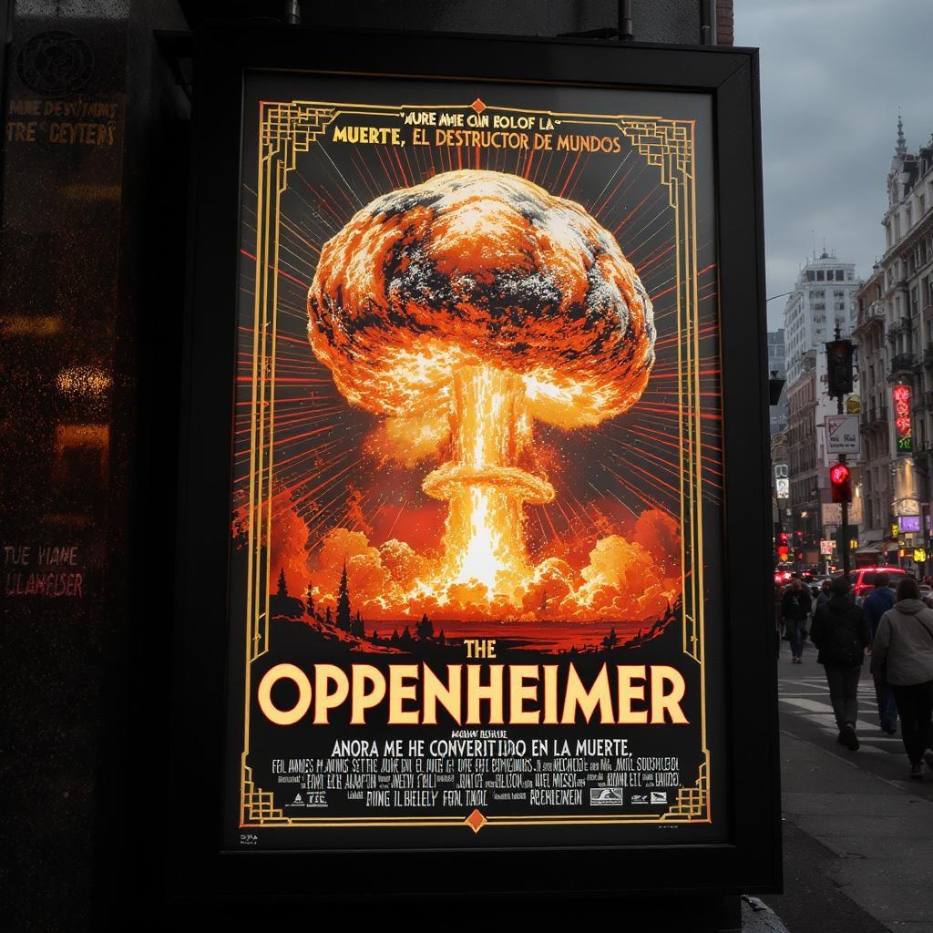 View this AI-generated image featuring an evocative movie poster for oppenheimer centered around a massive nuclear explosion with the haunting phrase ahora me he convertido en la muerte el destructor de mundos featured prominently the poster is set in an urban landscape where it grabs the attention