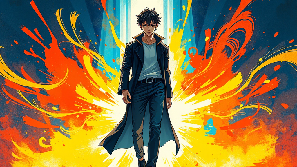 Movie poster featuring a male character dressed in black, white, and blue attire, capturing the essence of Yoh Nagao's style. The design emphasizes light as a core element, enhancing the dramatic and dynamic effect. The character stands against an abstract, vibrant backdrop, incorporating swirling patterns and bursts of color that suggest movement and energy. The composition is elongated, creating a sense of verticality and grandeur, while maintaining a modern and stylized look with an artistic flair.