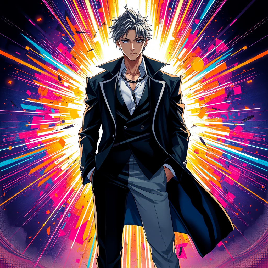 Movie poster featuring a male character dressed in a sleek combination of black, white, and blue, set against a dynamic, light-infused background. The poster reflects a vibrant and energetic style influenced by Yoh Nagao, emphasizing intricate patterns and bold colors. The character stands confidently, capturing attention with his intense gaze and a hint of mystery. Light beams and abstract graphic elements swirl around him, creating a sense of movement and depth that draws viewers in, hinting at an adventurous and thrilling narrative. The composition balances symmetry and chaos, inviting viewers into a world where reality blends with artistic imagination.
