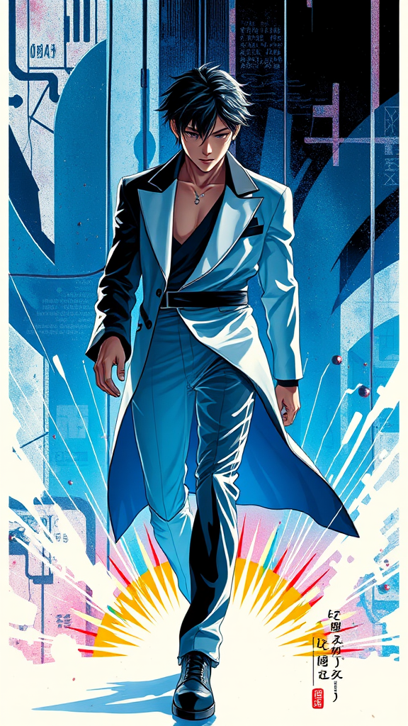 Movie poster featuring a male character dressed in a sleek black, white, and blue ensemble, evoking the vibrant and dynamic style of Yoh Nagao with an emphasis on light and shadow interplay. The composition is elongated vertically, highlighting the character's dramatic stance amidst a backdrop of abstract patterns and luminous bursts, capturing a futuristic yet artful essence.