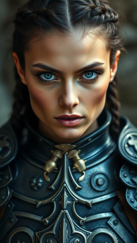 Moving upward from her armor, your attention is drawn to the exquisite details of her visage. Her eyes are striking, exuding a powerful sense of strength and resolve that is almost tangible. Her high cheekbones impart an aura of nobility and elegance. Her hair is expertly braided, accentuating the lines of her face and emphasizing the allure of her features.