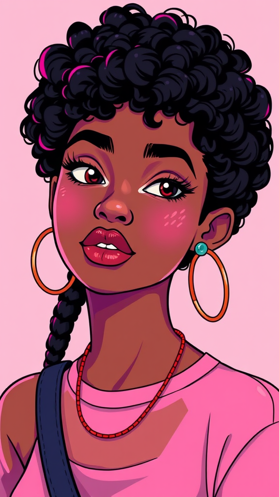 Mulatto woman with an afro hairstyle and a nose ring, styled in the digital art aesthetic reminiscent of Yanjun Cheng, influenced by the lofi girl internet meme. A vibrant cartoon-style illustration combining elements of retro anime and pastel color schemes, evoking the trending art scenes on Dezeen. The piece takes on a catalog photo quality with a 3D-inspired render akin to the works of Beeple, Rhads, and Lois van Baarle. The artwork stands out with its bright pastel palette and represents a beautiful, modern interpretation of a classic anime girl.
