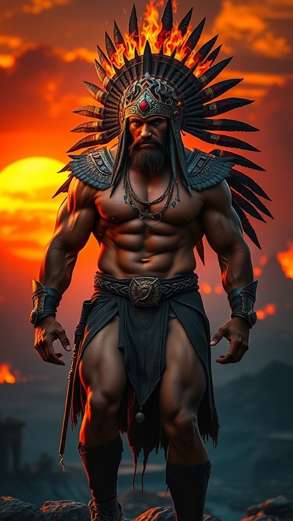 A savagely muscular 35-year-old man stands poised against the backdrop of a burning city, the sun setting in dramatic, vibrant hues of orange, red, and turquoise. His entire form, from head to toe, exudes brutal elegance, with a hyper-realistic portrayal capturing finely detailed features—every muscle and vein emphasized by the dramatic lighting. He wears an epic, ancient-era attire that merges seamlessly with the dark theme and aesthetics enveloping the scene. The centerpiece of his ensemble is a majestic headdress—a colossal creation, ablaze with fire, intricately designed from mysterious, ancient materials. This powerful headdress commands attention, enhancing his formidable presence. The sunset's warm colors embrace the scene, complimenting the fiery and turquoise elements of his garb, creating an extremely vibrant, mesmerizing display against the tumultuous background.