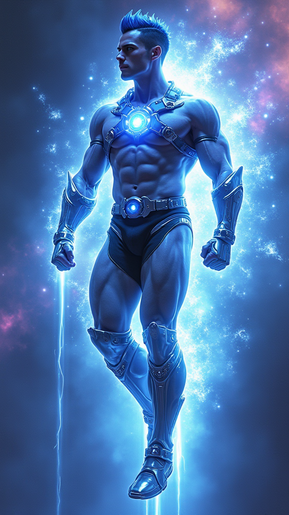 Ultra-futuristic super-hero, cosmic being, space warrior. He radiates energy like a star, and can blast his enemies with pure blue-violet cosmic energy/light. His eyes shine with pure white light like stars. He can create and control energy on a molecular level, giving him near limitless power. He can fly through the vacuum of space without needing to breathe, he lives in the cosmos. Hypermasuline Caucasian male. Tall, muscular, bodybuilder's physique, perfect body. Large massive muscles, wide chest and back, well defined abs, narrow waist, thick sinewy arms with big biceps. Strong powerful legs. Strong brow and squared jaw, handsome masculine rugged face. Clean shaven hairless face, super-hero good looks. Eyes shine like stars with pure white light. High fade medium spike hairstyle, short on sides and back, medium spikes on top of head, longer towards the front. Hair is blue-black, dark and shiny. He is completely shirtless, only a shiny chrome harness across his massive chest. A chrome tech belt around his waist with a blue-violet light a the center. Shiny chrome gauntlets on his forearms, also with blue-violet lights. Thin chrome bands around the tops of his biceps. Chrome tech pauldrons on his shoulders, also with blue-violet lights. A shiny chrome jockstrap over his loins, chrome thigh-guards over his massive thighs. Metallic chrome knee-high boots. Full body pose, flying through space, radiating bright blue-violet light. His physique is beautiful to behold...
