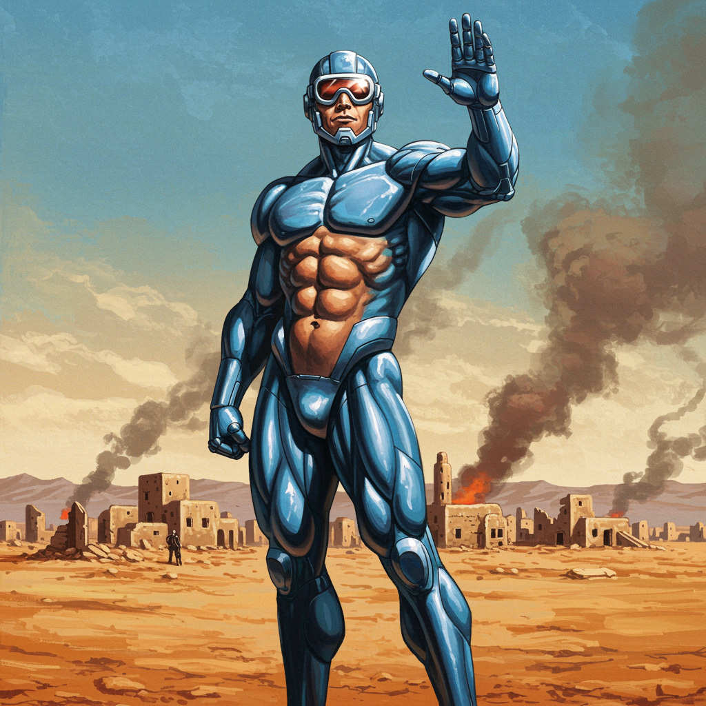 A towering, muscular figure clad in shimmering blue body armor stands resolute against the backdrop of a desolate desert village, smoke slowly rising from its silent ruins. His chiseled physique reflects the strength and determination of a warrior, the contours of his abs pronounced beneath the armor's protective curves. Futuristic goggles cover his eyes, and a sleek, robot-like headpiece gleams under the harsh sun, merging seamlessly with his commanding presence. He raises a hand, a gesture of both defiance and hope against the barren landscape. The scene is painted in the dramatic, vivid style reminiscent of Boris Vallejo and Frank Frazetta, capturing the raw power and majesty of a hero in a world teetering on the brink. The artwork, infused with the depth and realism familiar to fans of Alex Ross, emphasizes the epic grandeur of this solitary figure, a guardian amidst the decay, unwavering in his resolve.