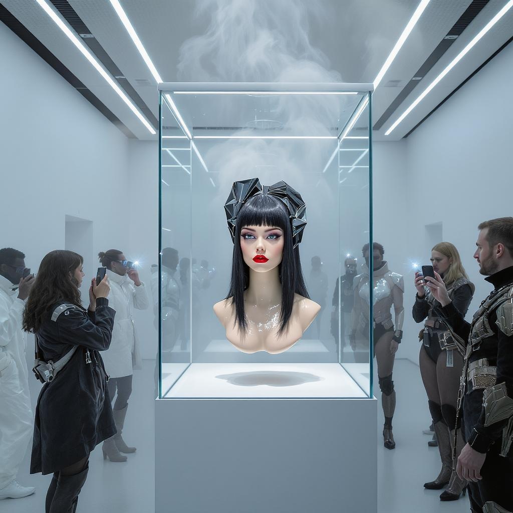 In a futuristic museum hall filled with a soft, drifting haze of mist, the space is entirely white, a purity so overwhelming it's almost disorienting. The ceiling features long, continuous LED strips that stretch across its surface, their glow partially absorbed by the swirling mist, creating an ethereal, diffused lighting effect. The room lacks doors or windows, heightening its surreal, otherworldly atmosphere. At the center stands a minimalist glass display case, showcasing a breathtaking floating female head with bold red lips, editorial-style makeup, dramatic contouring, and shimmering metallic highlighter. She wears an avant-garde wig with black, long textured hair and a short fringe, adorned with small metallic pins. The hair is sculpted into futuristic, architectural shapes and intricate geometric designs, giving the illusion of suspension in mid-air with no body visible, just the striking, levitating form. Surrounding the display are elegantly dressed individuals in avant-garde, high-fashion futuristic attire, admiring the wig and capturing it with smartphones. Their outfits boast bold, sculptural silhouettes, reflective metallic fabrics, exaggerated shoulders, high-neck collars, intricate laser-cut details, and asymmetrical designs. Some wear visor-like glasses, glowing accessories, and gravity-defying structured garments. The camera flashes reflect off the glass, creating a mesmerizing interplay of light. The scene is eerily mesmerizing, blending high fashion, advanced technology, and an air of mystery, with futuristic aesthetics, editorial styling, and avant-garde fashion elements resembling a high-end fashion editorial from a distant future.
