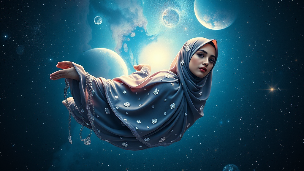 Muslim hijabi women adorned with shimmering diamonds, ultra-realistic, gracefully drifting through the vast expanse of the cosmos, stars twinkling around them and nebulae casting a soft glow.