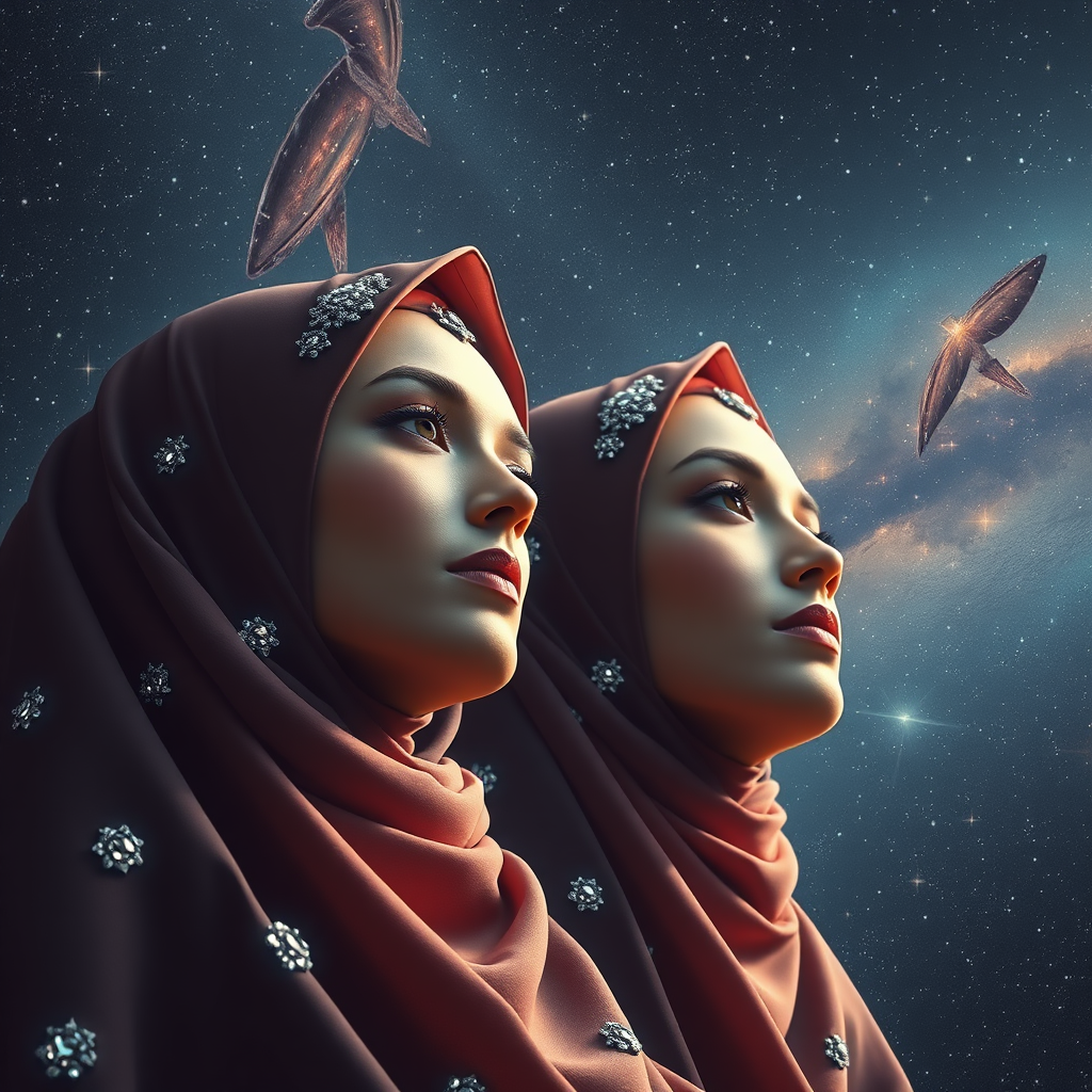 Muslim hijabi women adorned with shimmering diamonds, depicted in hyper-realistic detail, gracefully drifting amidst the vast cosmos, with stars and galaxies casting ethereal light, --ar 9:16