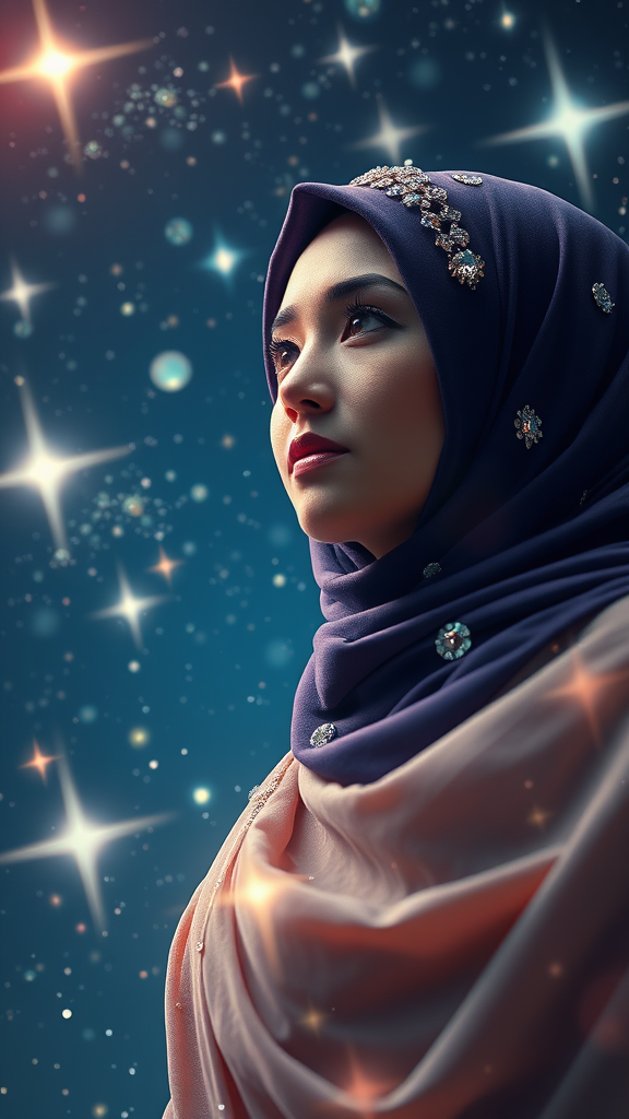 Muslim hijabi women adorned with sparkling gems, hyper realistic, gracefully drifting through the cosmos with shimmering stars --ar 9:16.