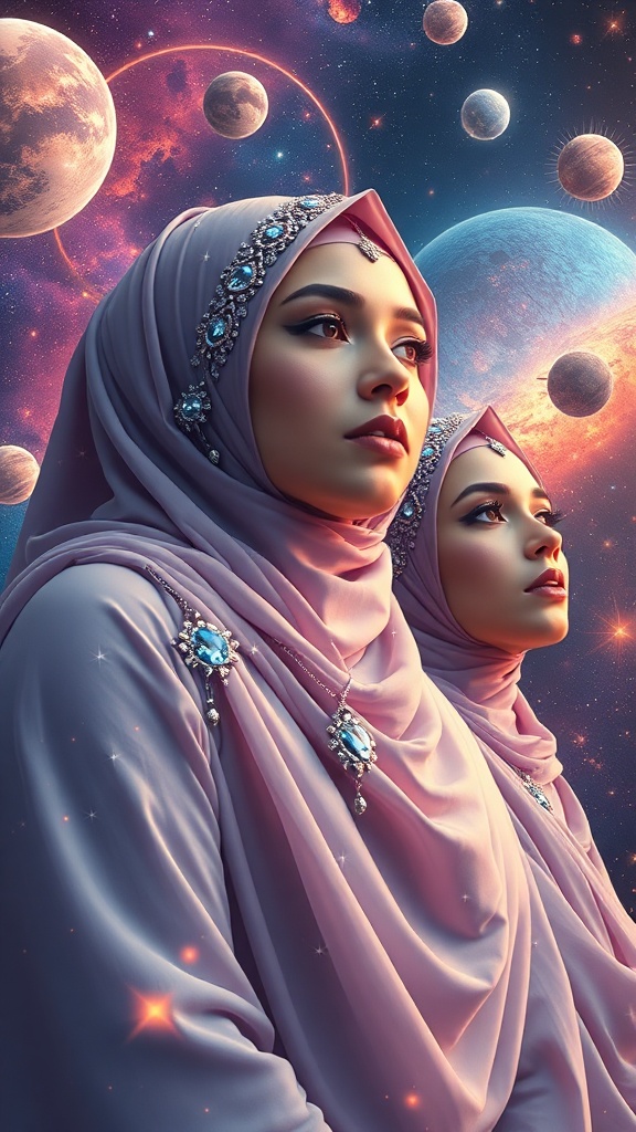 View this AI-generated image featuring muslim hijabi women adorned with shimmering gemstones set against the backdrop of a vibrant cosmic expanse hyper realistic drifting gracefully amongst celestial bodies ar 9 16. Created using advanced AI technology, this image showcases photorealistic rendering,