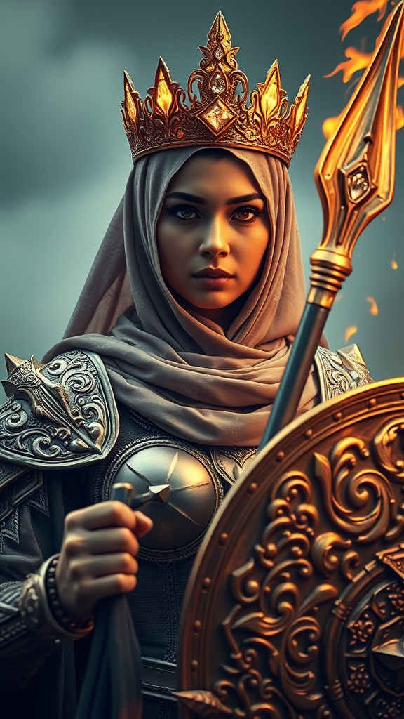 Muslim queen of fire character wearing a hijab with a glowing aura, a crown crafted from gold intertwined with diamond flames, photorealistic and grand with epic, dramatic lighting, directly facing the camera. Intricately designed, shimmering armor, holding a sleek, ornate spear and a beautifully embossed shield, demonstrating exquisite craftsmanship with ultra-realistic textures. Captured using state-of-the-art photography lighting techniques, featuring an overcast ambiance with precise reflection mapping. The scene is cinematic and hyperrealistic, conveying focused intensity, enhanced with VFX post-production and RTX ray tracing, achieving a high-quality render in 8k resolution. The composition is detailed and deep with a pronounced depth of field and authentic shadow casting.