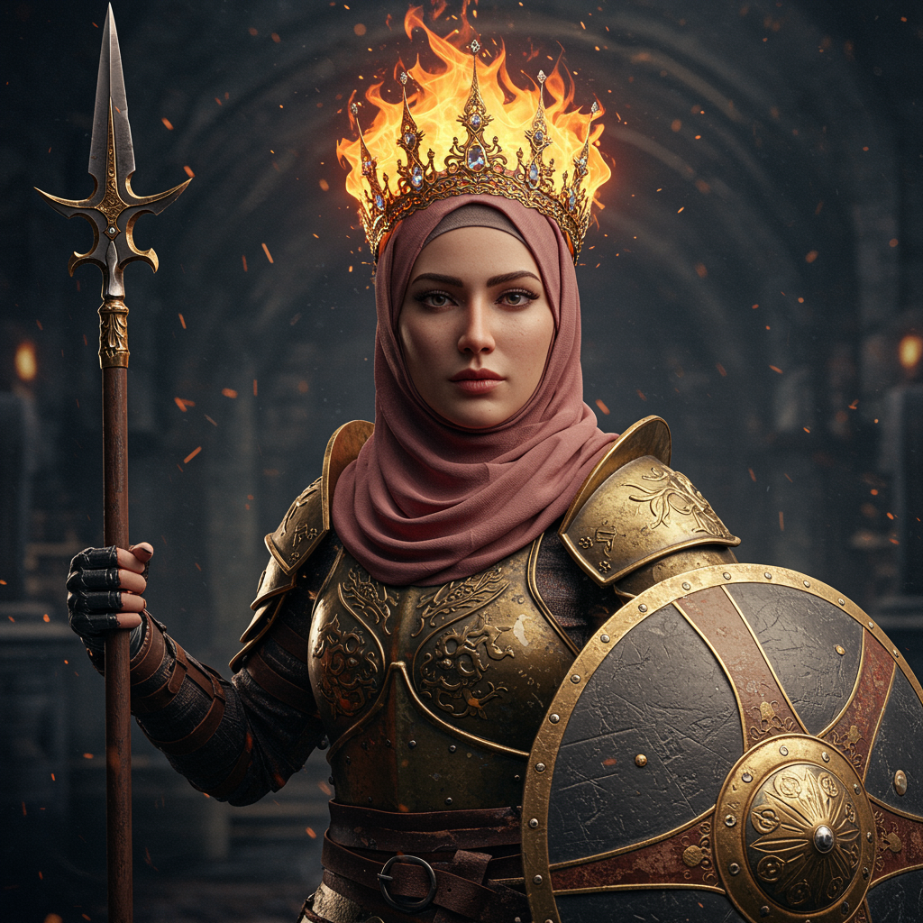 Muslim queen of fire character wearing an elegant Hijab scarf, a crown crafted from intertwined gold and diamond flames, photorealistic and captured in epic, dramatic lighting, facing the camera with finely detailed armor. She wields a spear and shield adorned with intricate designs and details. Ultra-realistic with cinema quality rendering, the scene focuses on high detail with octane rendering, enhanced by 8k resolution, depth of field, and real shadow effects. Overcast reflection mapping and VFX post-production techniques create a hyperrealistic and focused result, utilizing RTX ray tracing lighting for a cinematic appearance.