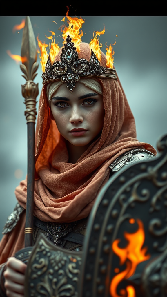 Muslim queen of flames character in a beautifully adorned hijab scarf, with a crown of shimmering gold and diamond-like flames, photorealistic and infused with epic, dramatic lighting. She's facing the camera, draped in finely detailed armor, holding a masterfully crafted spear and shield. Her attire is intricately designed, showcasing ultra-detailed and hyper-realistic craftsmanship. The scene has cinematic movie-quality rendering with overcast reflection mapping and natural photography lighting. The depth of field highlights her focused gaze, enhanced by real shadow. Enhanced with VFX post-production and RTX ray tracing lighting for a truly stunning visual in 8k resolution. The composition captures her regal and powerful presence with a slightly overcast, moody ambiance.