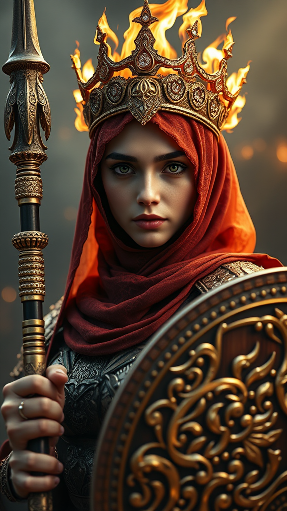 Muslim queen of flames wearing a luxurious hijab adorned with a crown of gold and diamond flames, deep photorealism capturing her essence, charismatically facing the camera under epic and dramatic lighting. Her finely detailed armor glimmers with intricate designs. She holds a majestic spear and ornate shield, showcasing an ultra-detailed craftsmanship, captured with the highest detail quality and ultra-realistic photography lighting. Subtle overcast reflection mapping highlights her regal stature. Her cinematic presence is rendered with movie-quality hyperrealism, revealing an intense focus and high level of detail, utilizing Octane rendering for added depth. The scene is enhanced by an 8k resolution, featuring depth of field and real shadows, and refined with VFX post-production techniques and RTX ray tracing lighting, capturing every nuance of her powerful persona.