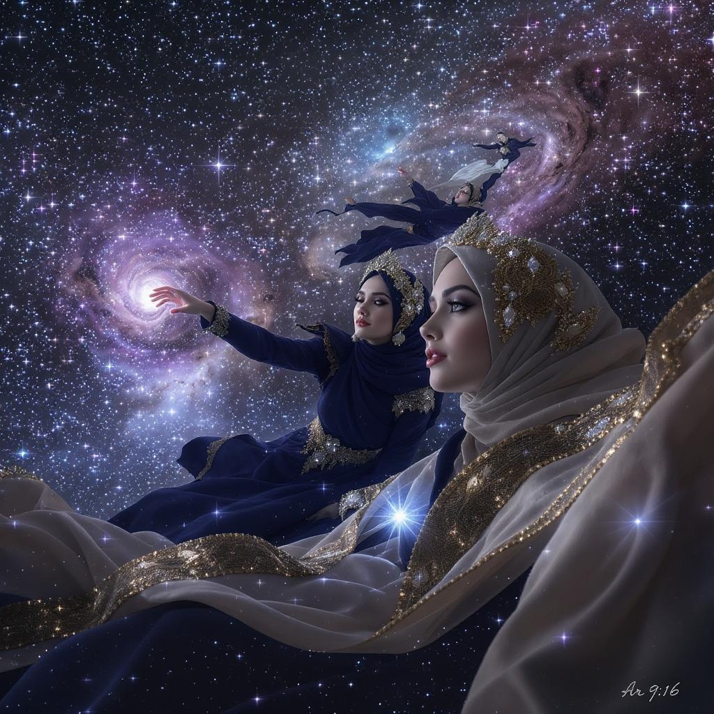 Muslim women in hijabs adorned with glistening jewels, hyper realistic, gracefully drifting through the cosmos with stars and galaxies illuminating their celestial journey --ar 9:16