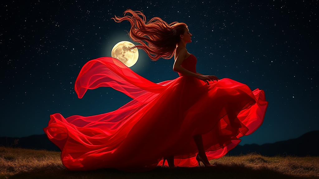 My crimson gown shimmers under the starlit sky, swirling in the shadows cast by the gentle glow of the moon, my hair an elaborate cascade reminiscent of a beauty pageant crown, high heels kicked aside, each step ignites a spark of life, my dress woven from wisps of red mist.
