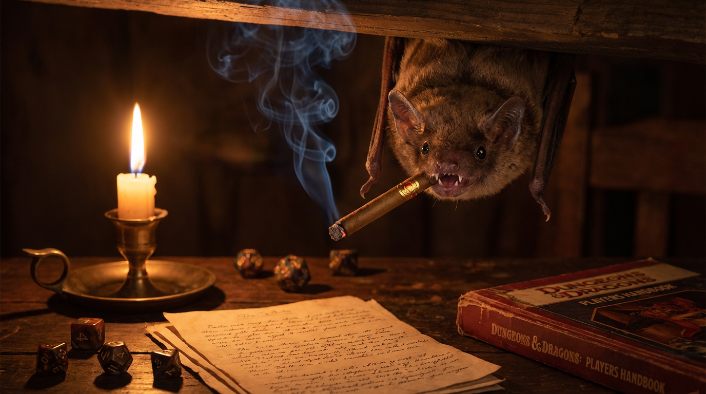 A brown bat with visible fangs hangs upside down, smoking a cigar, with wisps of smoke curling upwards. The scene is dimly lit by a candle, illuminating D&D dice and a Players Handbook on a wooden table, creating a cozy and eerie atmosphere.