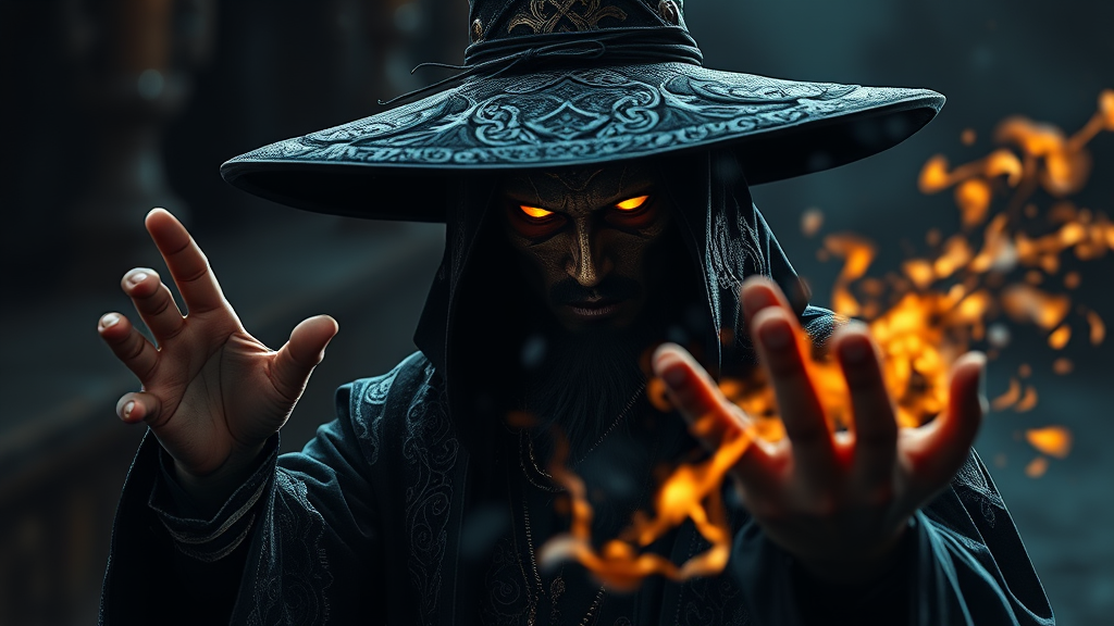 Mysterious dark-robed sorcerer inspired by final fantasy, adorned in intricate ink-styled patterns with glowing eyes peering from beneath a wide-brimmed hat, casting a powerful spell under dramatic, shadowy lighting, portrayed in a wide-angle scene with an otherworldly ambience, captured in stunning 4k resolution, rich colors and fine details merge in a mystical 3:2 composition, subtle creative elements woven into the iconic design.