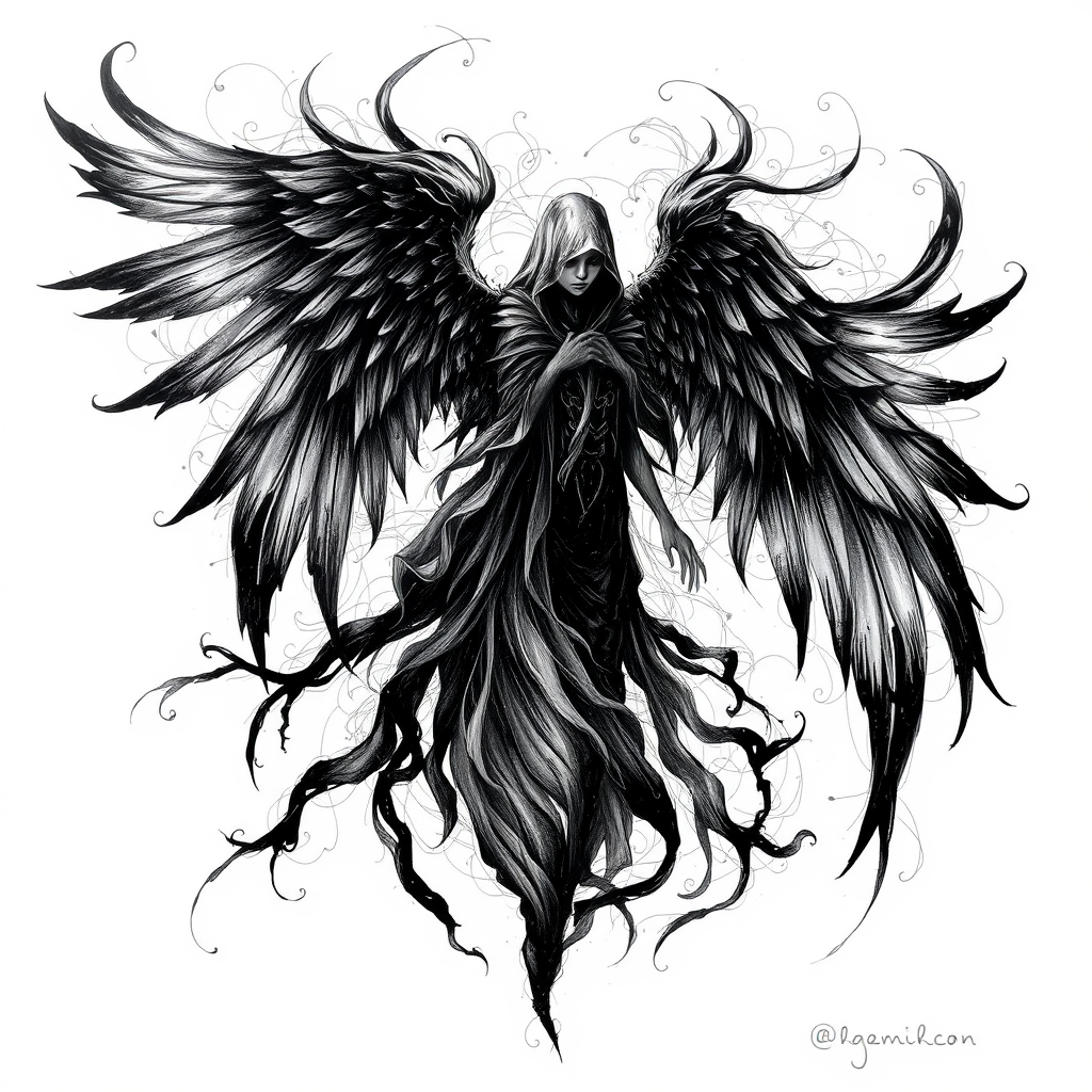 Mysterious ethereal figure with flowing dark wings, depicted in intricate ballpoint pen strokes, exuding an aura of enigmatic grace and shadowy elegance amidst a backdrop of swirling ink patterns.