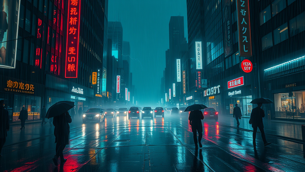 mysterious rainy cityscape, neon lights reflecting off slick streets, shadowy figures moving through mist, distant thunder echoing, hidden stories beneath every umbrella, a sense of intrigue in the night air