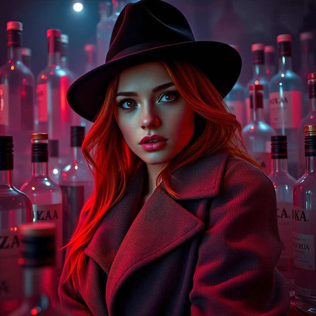 Mysterious scene with lofi colors and vibes, featuring a stunning young woman with blazing red hair and deep brown eyes, posed in a relaxed yet energetic manner. She wears a sleek grey coat and a stylish black hat, surrounded by an impressive collection of vodka bottles. Captured in a professional 8k photorealistic style, the setting is bathed in soft natural and dramatic lighting, utilizing magic photography techniques. The scene is intricately detailed with excessive attention to detail, reminiscent of artstation and concept art styles, with smooth, sharp focus. Enhanced by ray tracing and volumetric lighting, the atmosphere is cinematic, achieved through octane render and epic post-processing. The image has an 8K wallpaper quality, with a touch of film grain, integrating 3D elements and a denoise effect. Captured in redshift style, it resembles a photoshoot with depth of field at f/1.8 and an 85mm medium shot. Enveloped in volumetric fog, the image trends on platforms like Instagram and Tumblr, presented in HDR 4k with highly detailed illustration and digital art, emphasizing depth of field and contrast.