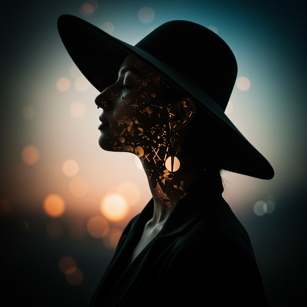 Mysterious silhouette of a woman wearing an elegant hat, inspired by the styles of artists Minjae Lee, Carne Griffiths, Emily Kell, and photographers like Steve McCurry. The image captures the imaginative touch of Geoffroy Thoorens and Aaron Horkey with its mesmerizing geometric patterns and intricate details. The composition boasts the depth and surrealism associated with Jordan Grimmer and Greg Rutkowski's work, featuring a stunning double exposure effect. The visual appeal is enhanced with a bokeh background, achieving a perfect balance of artistic photorealism and smooth, vibrant colors. The woman's exaggerated nose adds an element of unrealistic, yet captivating charm. This piece combines techniques from painting, drawing, sketching, and anime, creating a seamless blend of 3D render qualities and CG aesthetics. The focus is on high contrast and saturation, avoiding any typical distractions like watermarks or logos, ensuring the piece remains of exceptional quality. Her long neck and closed eyes are adorned with subtle face jewelry, completing the enigmatic aura.