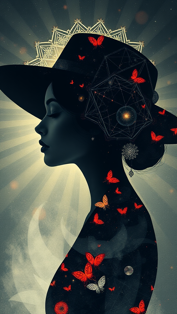 Mysterious silhouette woman with a hat, inspired by Minjae Lee, Carne Griffiths, Emily Kell, Steve McCurry, Geoffroy Thoorens, Aaron Horkey, Jordan Grimmer, and Greg Rutkowski. Captivating depth with double exposure, surreal geometric patterns, rich details, and enchanting bokeh. Exquisitely balanced and artistically photorealistic with smooth, vivid, high-contrast visuals. Features a distinct profile with a prominent nose. An artistic blend of painting, drawing, sketching, and elements of cartoon, anime, manga, and 3D render. Free from watermarks, signatures, labels, and grainy textures. Featuring a gracefully elongated neck and thoughtfully adorned closed eyes with face jewelry.
