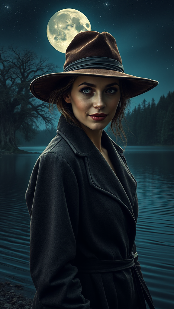 Mysterious woman in a worn, velvet wide-brimmed hat and a faded, long coat standing by the rippled edge of a serene, moonlit lake, surrounded by towering ancient trees under a dramatic, star-filled night sky, illuminated character portrait, refined closeup of the subject's enigmatic, weathered features and subtle, knowing smile, detailed character art portrait, introspective closeup, dark and moody flyer, vintage-weathered, eustace tyler-inspired cgsociety-style portrait, heavy, romantic, and complex connection to the water and the surrounding environment.