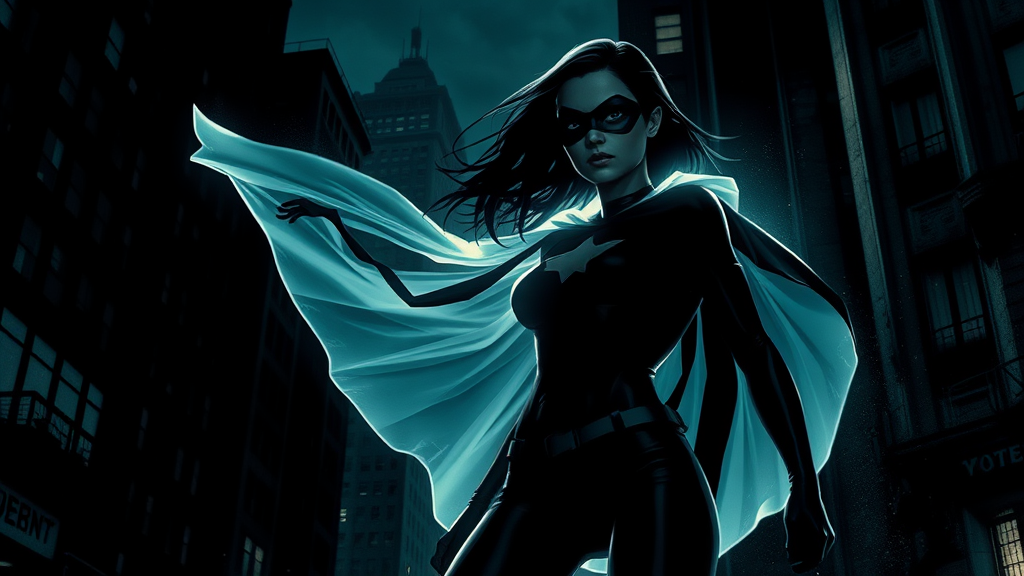 Mysterious young female superhero, enveloped in an ethereal glow resembling a will-o'-the-wisp, navigates a shadowy urban landscape reminiscent of a Frank Miller graphic novel. The city is steeped in darkness, with moody, atmospheric lighting casting elongated shadows. She strikes a dynamic action pose, exuding confidence and poise amidst the gritty backdrop. Her silhouette is sharp and striking, with a cape fluttering in the night air, as her eyes gleam with determination and hints of luminescent energy.
