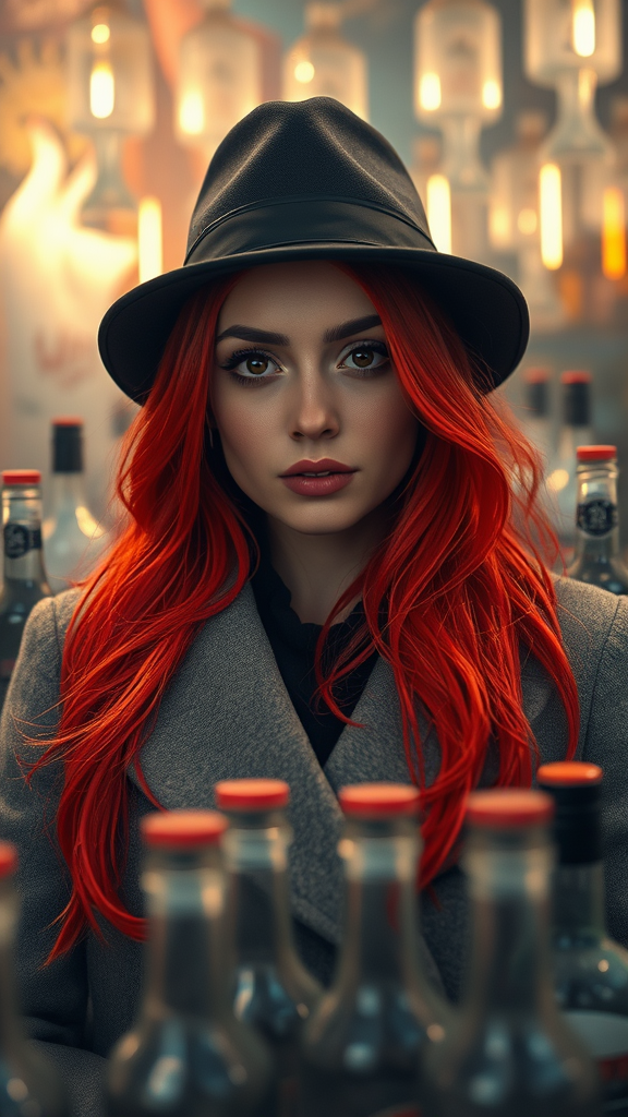 Mystery and lofi vibes envelop a scene featuring a stunning young woman with vibrant red hair and deep brown eyes. She exudes a relaxed yet energetic aura, dressed in a sleek grey coat and wearing a classic black hat. Surrounded by a myriad of vodka bottles, the atmosphere is charged with an overwhelming sense of energy. Captured in professional, photorealistic quality, the portrait photography emphasizes her enchanting presence through soft natural lighting and dramatic contrasts. With excessive detailing and an intricate, hyper-detailed approach, the image embodies artstation concept art style, enhanced by smooth, sharp focus and ray tracing. Volumetric lighting and cinematic elements, combined with epic post-processing techniques like octane render, produce an extremely high detail finish. In 8K resolution with film grain texture, this 3D masterpiece balances depth of field at f/1.8 using an 85mm lens, offering a mid shot. Volumetric fog adds to the intrigue, making it a visual treat trending on Instagram and Tumblr. Further enhanced by HDR effects, the highly detailed digital art and painting create a stunning 8K illustration, perfectly capturing depth, contrast, and photographic realism.
