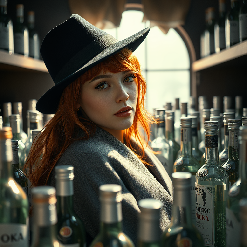 Mystery, lofi aesthetics, lush young woman with fiery red hair and deep brown eyes, a serene pose exuding vibrant energy, draped in a grey coat and adorned with a sleek black hat, surrounded by a surreal number of vodka bottles, capturing the essence of professional real-world photography in 8k resolution. The scene is bathed in soft, natural light, invoking magic through dramatic lighting and photorealism. Intricately detailed with excessive precision, the image is inspired by ArtStation's concept art style, boasting smoothness and sharp focus. Enhanced by ray tracing and hyper detailing, the setting is awe-inspiring, utilizing volumetric and cinematic lights. Post-processed to perfection with an epic cinematic flair, the octane-rendered piece achieves extremely high detail. Features like film grain, denoise, and a Redshift touch contribute to a captivating effect, as if captured in a high-resolution photoshoot. The medium shot uses depth of field with f/1.8 and an 85mm lens, enveloped in volumetric fog that trends across social media platforms like Instagram and Tumblr in HDR 4k and 8k. This highly detailed illustration, a blend of digital art and painting, plays with depth of field and contrast, creating an enchanting visual masterpiece.