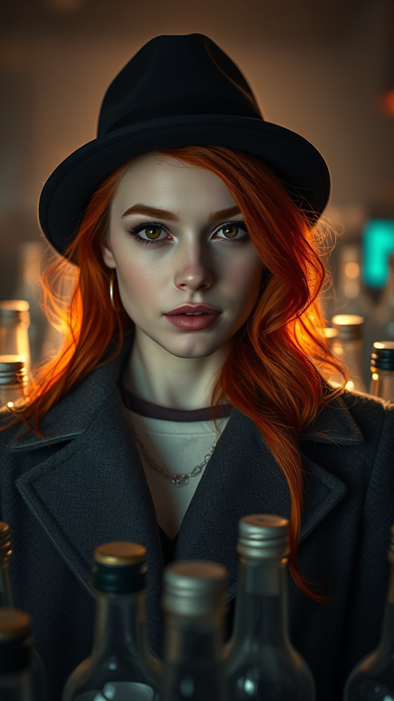 mystery, lofi hues, lofi ambiance, stunning young woman with fiery red hair and deep brown eyes, posed in a state of calm, vibrant energy, charcoal grey coat, sleek black hat, dynamic aura, countless vodka bottles spreading around, professional-grade photography, lifelike, expertly captured in 8k, gently diffused natural lighting, portrait artistry, enchanting photography, dramatic shadows, photorealistic flair, minute detailing, complex, hyper-detailed, inspired by artstation and concept art styles, velvety, precise focus, enhanced with ray tracing, extensive detail, magical volumetric lighting, cinematic effects, creative photo bashing, epic visual storytelling, rendered with octane, ultra-high detail, refined post-processing, ideal as 8K wallpaper, cinematic film grain, 3d elements, carefully denoised, influenced by redshift, innovative photo shoot, pronounced depth of field, shot at f/1.8 with an 85mm lens, medium framing, atmospheric volumetric fog, popular on instagram, sought-after on tumblr, hdr in 4k and 8k resolutions, intricately detailed illustrations, digital artistry, digital painting prowess, pronounced depth of field, striking contrast, maintaining a consistent visual narrative.