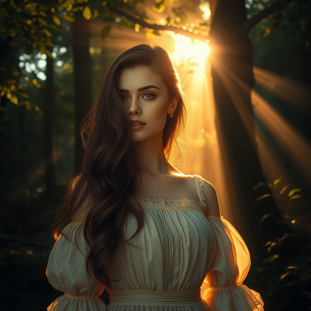 Mystical and enchanting forest with radiant sunbeams filtering through lush foliage, a young woman with a realistic and proportional face, cascading long hair, and a graceful full body adorned in a vintage dress, bathed in mystic incandescent light with an ethereal aura glow. The scene is cinematic and dramatic, evoking a heavenly and divine presence with a touch of melancholy, captured in ultra-high definition. The atmospheric composition highlights celestial elements reminiscent of Elly May's style, with extremely high details, presenting an ultra HD, HDR, 8k visual experience.