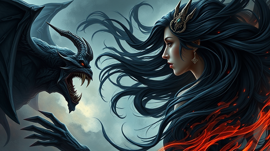 Mystical figure with cascading ebony hair facing a menacing demon, fantasy art style, flowing black tresses, legendary fantasy card game illustration, woman composed of dark flames, mysterious side profile of an enigmatic witch, the enchantress, ultra high definition, 4k, dramatic lighting effects, nfixer, nartfixer.
