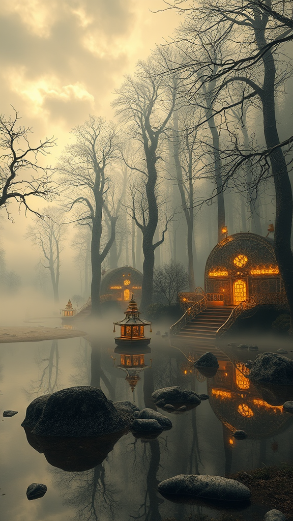 Mystical forest shrouded in fog, where witches weave spells amidst high contrast scenes; a photo capturing the enchantment of sand and ethereal lights. Twisted, sketch-like structures rise from reflective waters, blending industrial elements with gold and crystal accents. Jewelry-like gems and a mystic air evoke a fantastic world, merging cyberpunk and steampunk aesthetics. Detailed concept art meets the surreal, reminiscent of Alice in Wonderland's whims. Thick, loud clouds gather, heralding a storm over a landscape where modern architecture coexists with ancient stone edifices of marble and ivory. A paradise both organic and rusty emerges, each detail rendered in 4k octane, a mind-blowing masterpiece of high contrast elements.