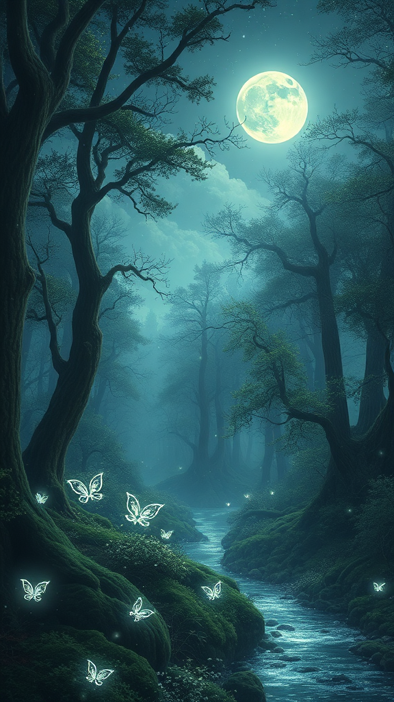 Mystical forest under a starlit sky, luminescent flora casting a gentle glow, ethereal creatures moving gracefully amongst ancient trees, their whispers carried by a soft breeze, moonlight dancing on a tranquil stream winding through the lush greenery.