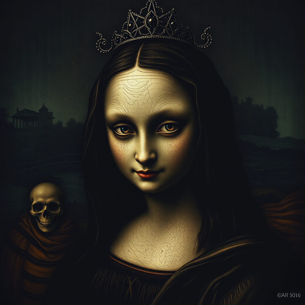 mystical mona lisa envisioned by tim burton, cinematic and hyper-realistic, intensely detailed, piercing gaze towards camera, infused with gothic and shadowy film noir elements, --v 4 --q 2 --ar 9:16 --s 600