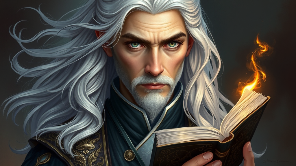 Mystical portrait of an enigmatic magic man with flowing white hair and silver accents, exuding maturity and serenity. His eyes are intricately detailed and kind, embodying an aura of wisdom and magic. Adorned in traditional, elegant attire, he holds an ancient tome, symbolizing his connection to the arcane. The composition is a digital painting, capturing a fantasy realm through smooth, sharp focus and intricate, multidimensional details. The scene is richly illustrated, highlighting an ethereal spirit and timeless elegance.