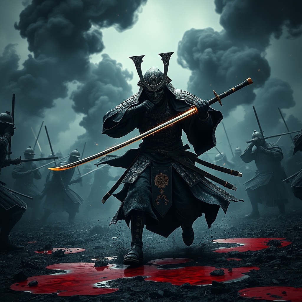 A masked mystical samurai, wielding a glowing mystical katana, charges through a grim battlefield, his star-dusted full-body armor shimmering against the dark, swirling plumes of jet-black smoke. The landscape is an epic tapestry of the Sengoku period, painted with morbid hues and Renaissance influences. Volumetric light pierces through the chaos, highlighting the atmospheric tension of winter. Crimson red puddles reflect the chilling surroundings as the samurai engages his enemies with precision. The scene is highly realistic and incredibly detailed, showcasing an ultra-wide epic shot reminiscent of an award-winning digital masterpiece crafted in Unreal Engine 5, with influences from Greg Rutkowski and Marc Simonetti, capturing the essence of a morbid yet captivating battle, filled with the intensity and texture of an extraordinary visual experience.