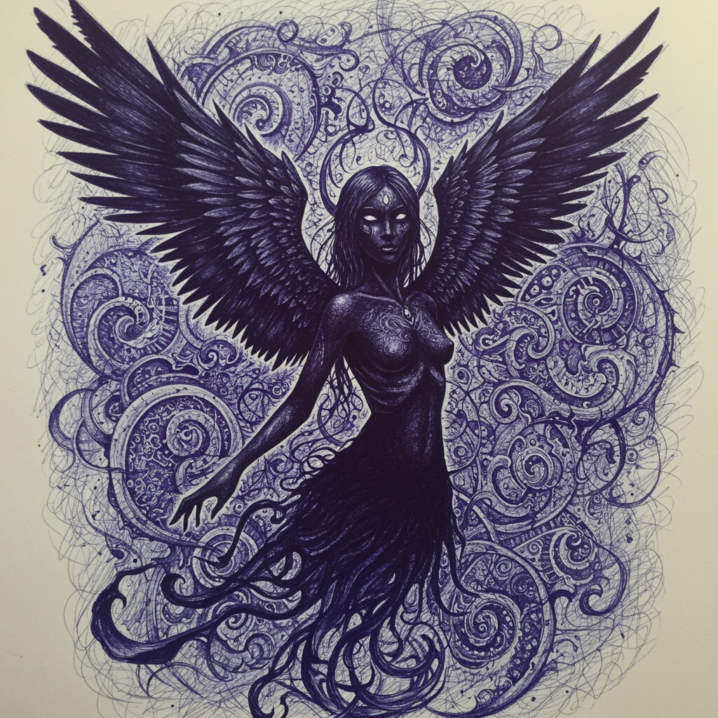 Mystical shadowy female figure with ethereal wings, rendered in intricate ballpoint pen detail, exuding an otherworldly aura amidst swirling abstract patterns.